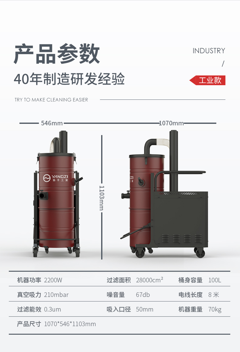 揚(yáng)子C10工業(yè)吸塵器配備2200W純銅線電機(jī);雙通道散熱模式吸力更持久,強(qiáng)勁真空吸力。升級(jí)100L工業(yè)級(jí)大容量塵桶,避免使用過程中出現(xiàn)反復(fù)傾倒的情況,創(chuàng)新多重過濾系統(tǒng),避免使用過程中出現(xiàn)二次污染問題。