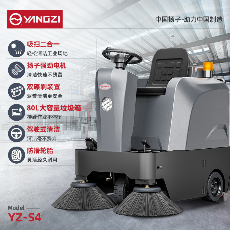 揚(yáng)子掃地機(jī)YZ-S4,大型工廠清潔,力度大吸力強(qiáng),掃吸灑三合一/大容量垃圾箱/液壓雙碟剎/揚(yáng)子強(qiáng)勁電機(jī)/應(yīng)用領(lǐng)域廣泛/輕松爬坡